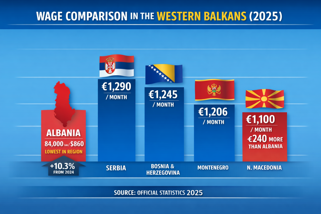 The average gross monthly wage in Albania reached around 84,000 lek ($860) in 2025, marking a 10.3% increase from the previous year, official statistics show. However, this remains the lowest level in the region, excluding Kosovo.